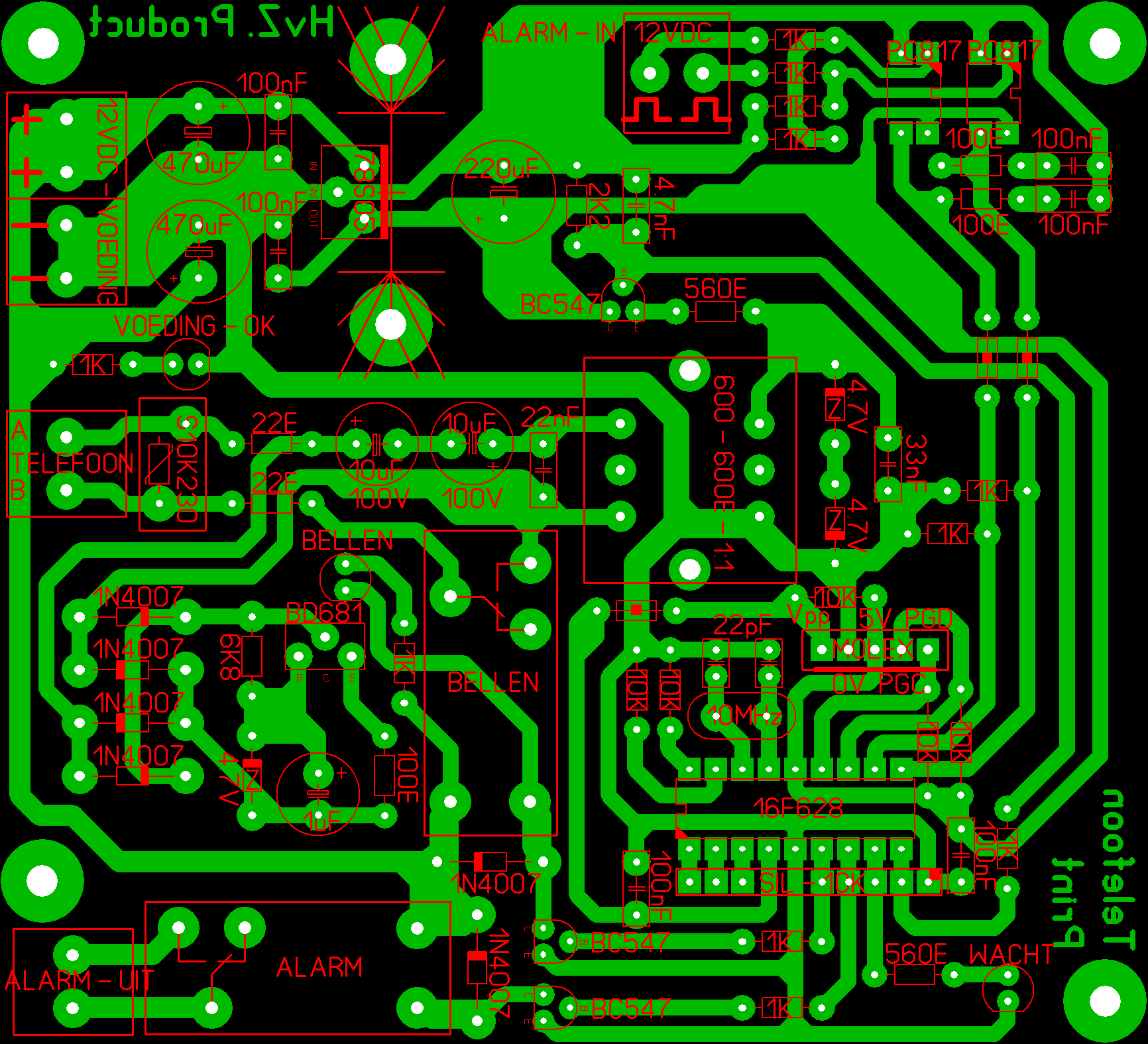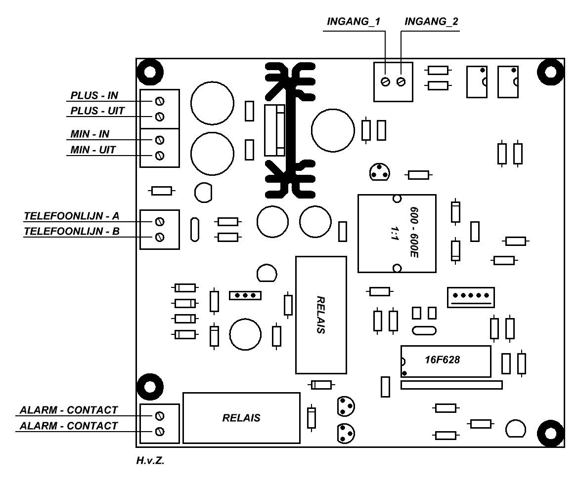 Hieronder de print met zijn aansluitingen. Zoals je kan zien heeft de print twee ingangen. De klemmen (plus – in en plus – uit) zitten aan elkaar, en dat geld ook voor klemmen (min – in en min – uit). Dit is gedaan om gemakkelijk een plus en een min daar weg te halen voor andere doeleinden. Daaronder zie je de telefoon aansluiting zitten, de A en B lijn mogen ook omgedraaid worden, dat maakt voor de werking niet uit. Het alarm contact van het relais is potentiaalvrij, daar kan dus van alles mee geschakeld worden.
