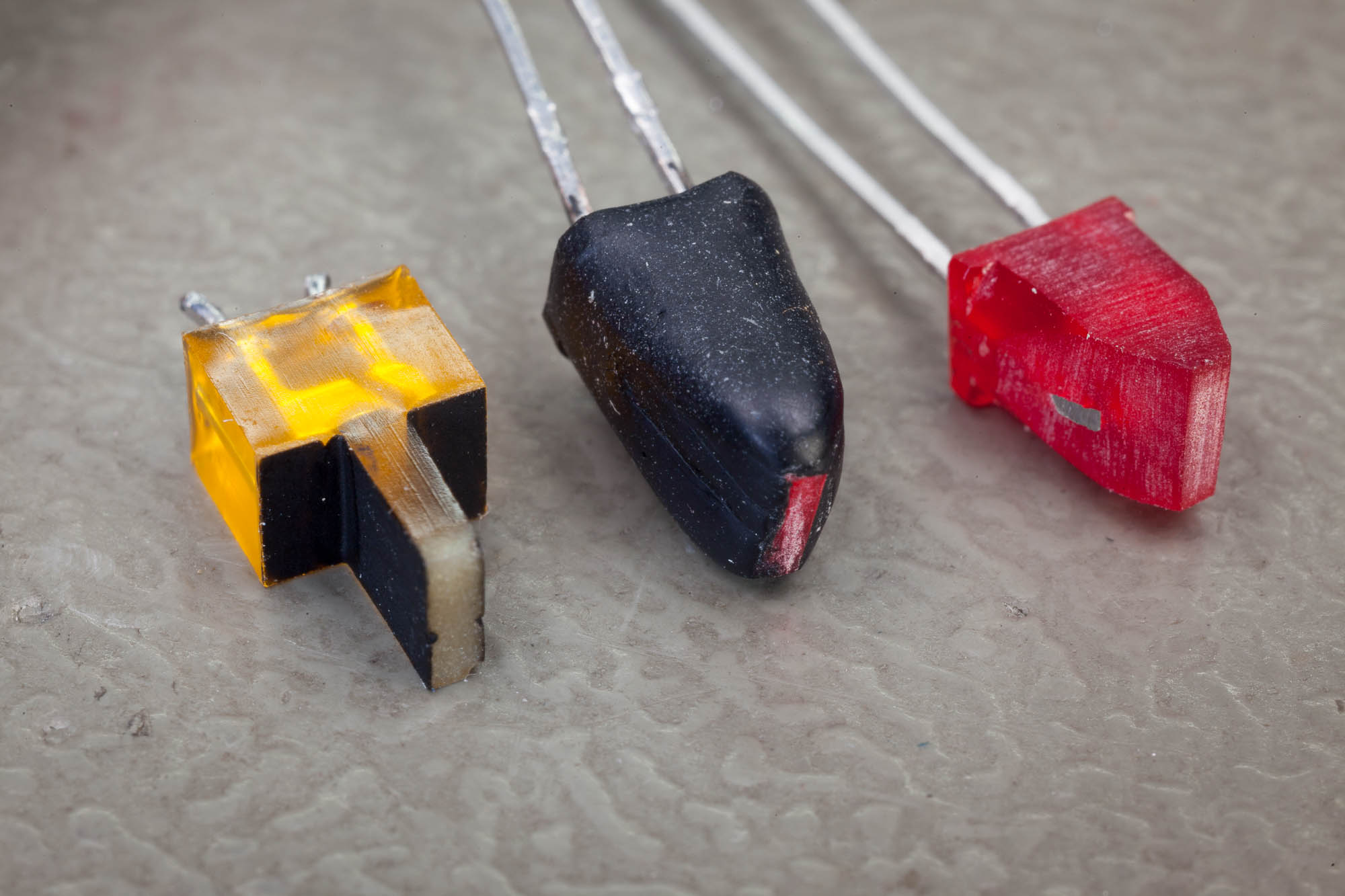 Links de originele LED, in het midden een diy vervanger, rechts een mislukte vervanger. Die rechtse LED laat ook meteen het probleem zien: De pennen zitten (op de print) verticaal, en daarmee ook het interne frame van de LED. Maar het streepje ligt horizontaal... Raak je met vijlen metaal, dan is meteen de LED defect....