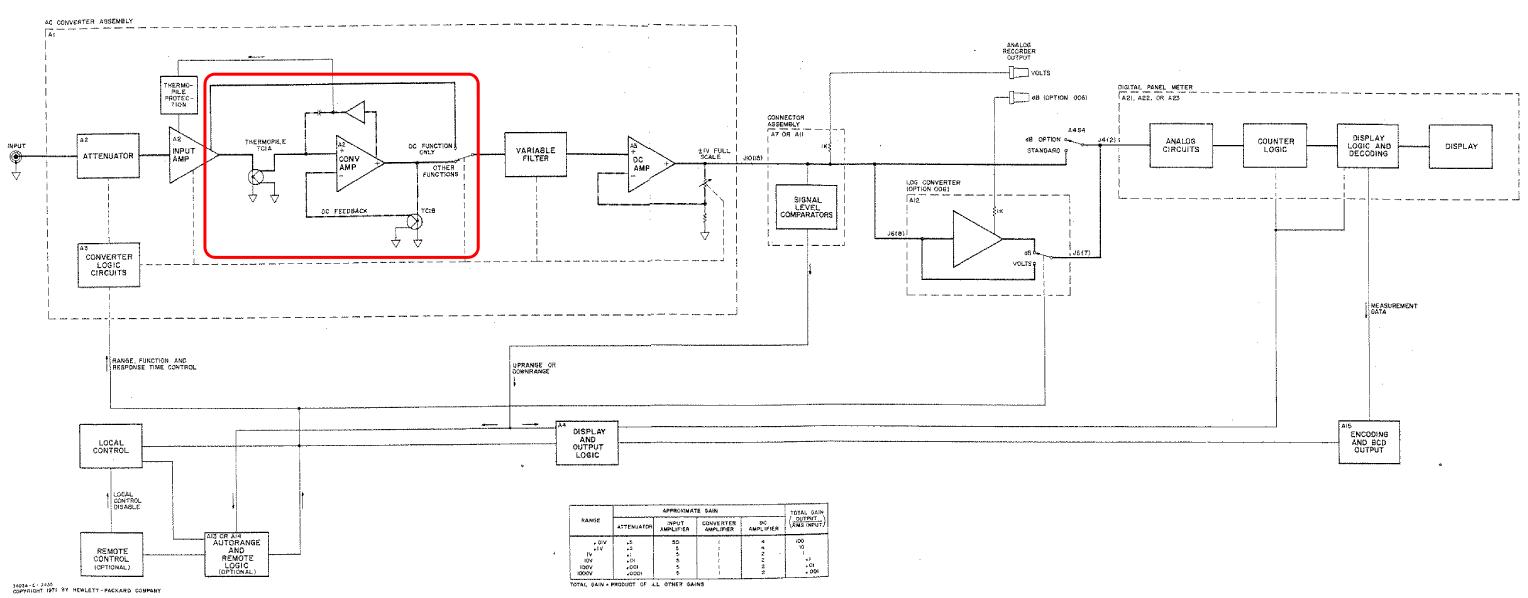Bij deze thermische RMS meter is elke RMS converter ("Thermophile" in HP taal) opgebouwd uit 30 thermokoppels, om de gewenste gevoeligheid te bereiken. die 30 thermokoppels zijn gebouwd met Thin film techniek, zodat de massa laag blijft, en daardoor de reactie snelheid hoog.
