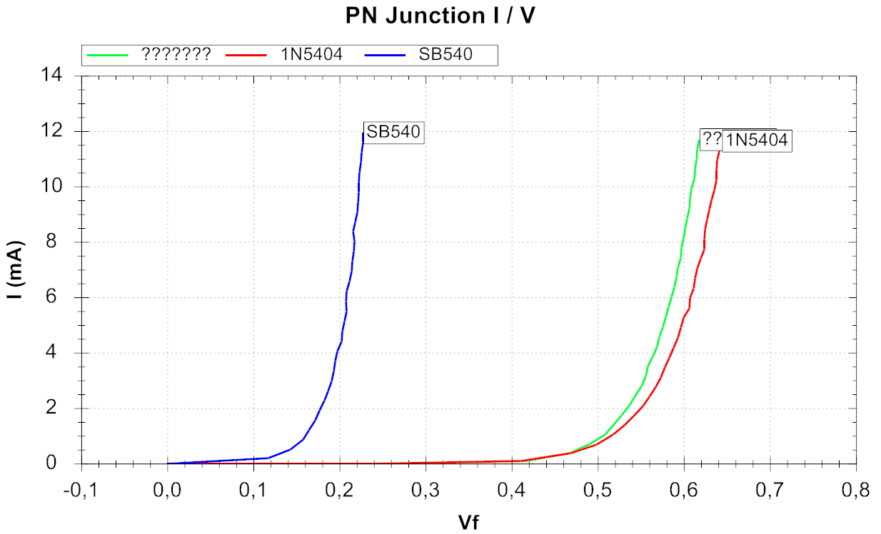 - Volgen mij is het een gewone Si diode. Ik heb met mijn Peak Atlas DCA75 de I-V curve gemeten: